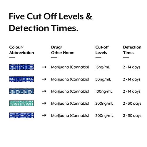 5 LEVELS OF SENSITIVITY: Each 5 level Marijuana (THC) rapid drug test dip card tests for the presence of Cannabis at 300ng/mL, 200ng/mL, 100ng/mL, 50ng/mL, and 15ng/mL allowing you to track sobriety level across time. The higher the ng/mL e.g. 300/200/100ng/mL that tests positive, the more time it will take to get clear. The lower the ng/mL e.g. 50/15ng/mL that tests positive, the less time it will take to get clear.